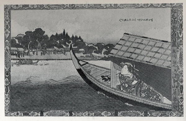 A woman peers out from under the bamboo blinds of a hiyoke-bune. The stempost has minimal decoration. The geta sandals left on the bow suggest that the custom of removing one’s footwear when entering a building applies on boats as well.