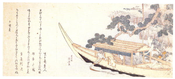 Three men and one woman ride in a hiyoke-bune; the woman trails a cloth in the water. The blinds are rolled up. The ferryman uses a ro to propel the boat, and the print clearly shows the placement of his leg and foot against the brace that would lie on deck.