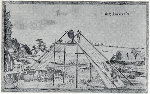 Two small boats are propped up on the shore behind the bridge. The kenzaki-miyoshi stempost and two strakes suggest they are oshiokuri-type vessels.