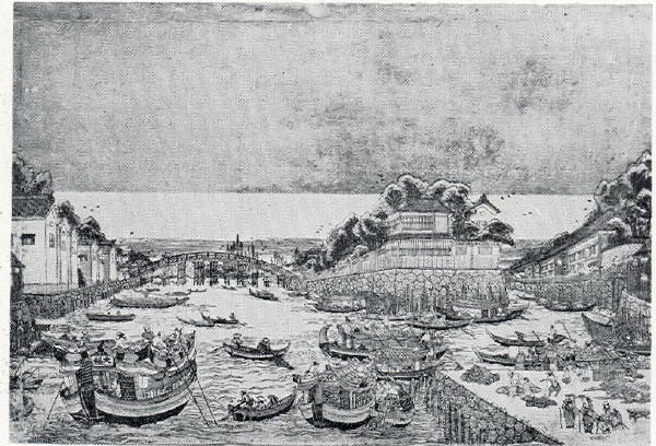 Several yakata-bune and other smaller vessels ply the river. Construction details are difficult to discern.