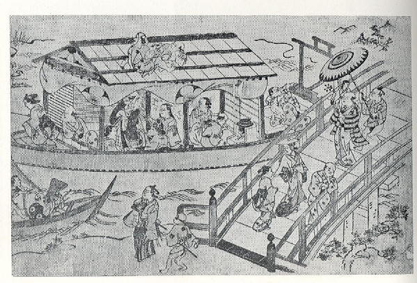 Two pleasure boats maneuver near a bridge in this picture. The construction on the stern of the larger vessel, usually used as a mast rest for unstepped masts, is unusually tall. It is unclear as to its use on this vessel as yane-bune generally did not have masts. A brazier is being used within the house, perhaps to prepare food.