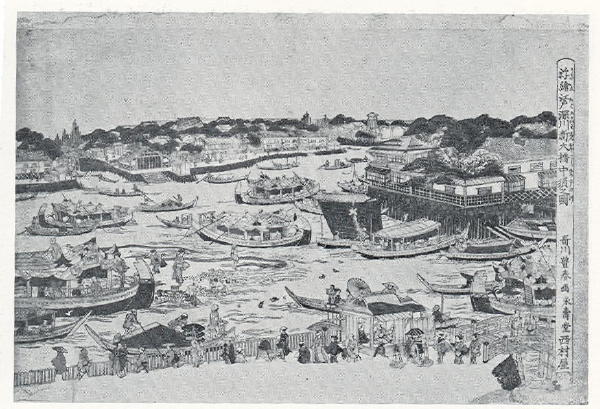 CATALOGUE 118. Nakasu and Shin Ohashi Bridge at Fukugawa in Edo, by Toyoharu (Kikuchi 1968).