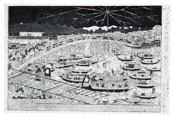 Many vessels gather by the bridge to watch fireworks. Two yakata-bune are identifiable by their notched stemposts, and are being maneuvered by polemen sitting on the roof. Most of the vessels are hiyoke-bune.