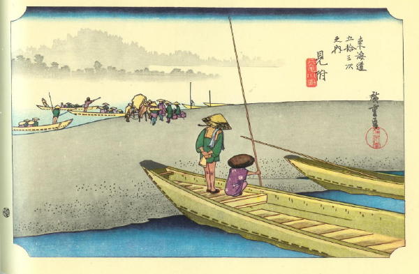 Mitsuke was the point for travelers to cross the Tenryū River from Edo to Kyoto. The strong current required ferries, not porters, to cross. Note the absence of any infrastructure (piers, docks) as the ferries were simply pulled up onto shore for easy boarding.