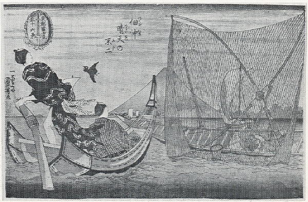 FIGURE 143. Fuji Viewed from Coast of Tsukuda, from 36 Views of Mt. Fuji from the Eastern Capital, by Kuniyoshi (Kikuchi 1968).