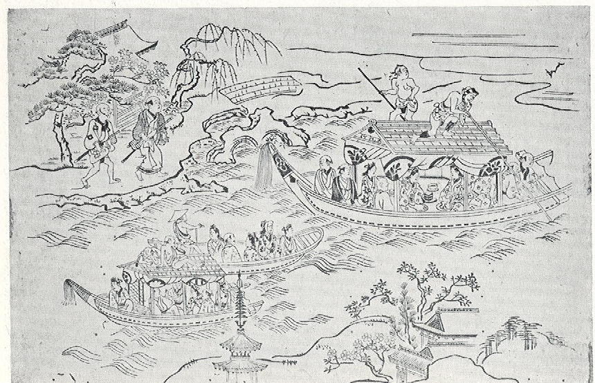 Two hiyoke-bune are shown men on the roofs, poling the larger boat. The stemposts of both are decorated with tassels. The bow of the third vessel is rounded, perhaps indicating a ferryboat.