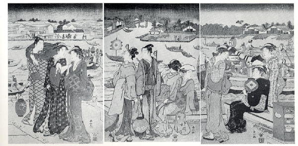 The watercraft in this print provide atmosphere for the summer festival scene. There are hiyoke-bune and smaller vessels, some with decorations. Construction details are not visible for most of these. Two yakata-bune are shown, with notched stemposts.