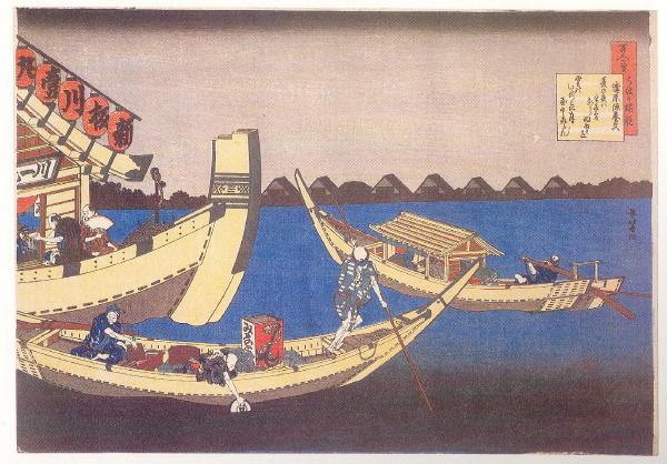 Pleasure boats are shown on the Sumida River. The two smaller boats may be supplying the larger boat, used for entertainment on the river and marked with the lanterns. The small foreground boat is poled by one of the crewmen. A lantern decorated with an image of an anchor rests in the center. The background hiyoke-bune and the foreground choki-bune both have similar, slightly decorated stemposts. Most distinctive, however, is the yakata-bune, with its typical notched, decorated stempost. An anchor with rope coiled at its foot sits at the bow.
