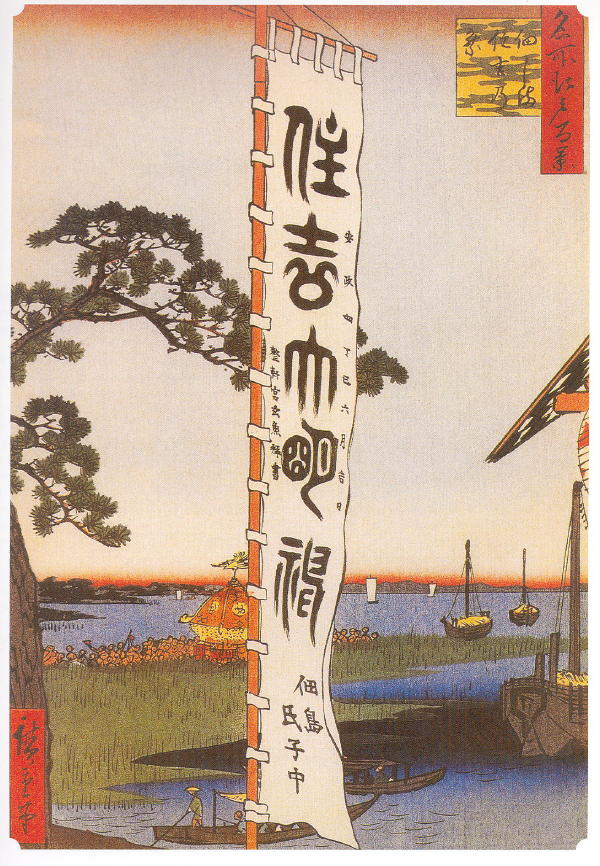 The deity of the Sumiyoshi shrine is the protector of seafarers. Bezai-type vessels and hiyoke-bune are in the water here. A festival procession moves along the shoreline.