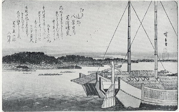 The sterns of two moored bezai-sen, distinguishable by the lattice railing, are visible here. One rudder is shipped while the other remains in the water. The planking of the stern is separate from that of the hull of the vessel, and the further ship shows the planking patterns of the underside of the stern. Bands hold the mast timbers together. Rushes cover the deck house.