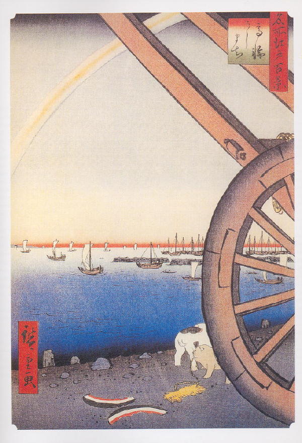 Many sailing vessels are depicted in background near Takanawa Gate (leaving the capital). At least one, with sail reefed, appears to be a bezaisen with the lattice railing on the hull. The others may be bezai- or takase-type vessels, based on general shape and size. PreviousNext