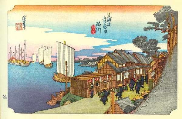 Cargo vessels piled high with goods pull up to the Tokaidō Road checkpoint area near Shinagawa. The ship nearest shore provides a clear view of the rudder half-pulled up into the stern. Shading suggests the joining of nine strips of cloth to form the sail.