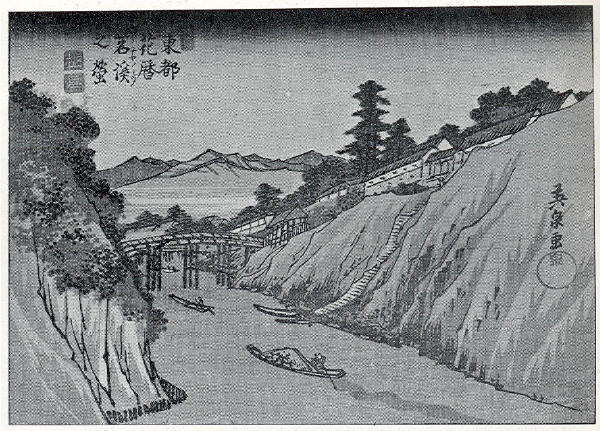 Cargo boats move upriver in a gorge near the bridge. A plank lies over the cargo to facilitate poling. Other construction details are indistinct.