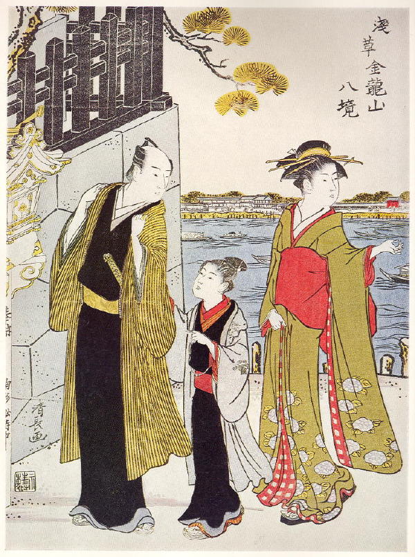 A family on a river bank approaches a temple. Several stylized vessels, including one yane-bune, appear in the background.